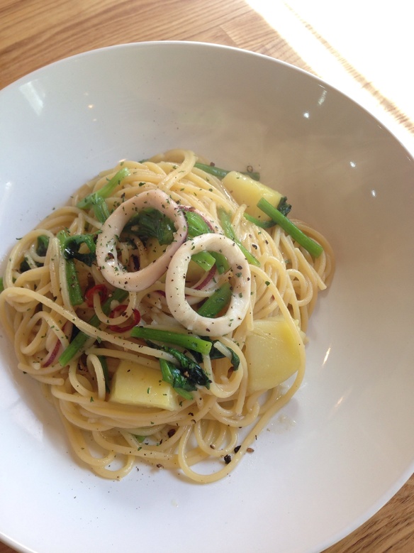 『イカとほうれん草のペペロンチーノ』 ¥830。今日も暖かくなる予報でしたので、さらりと食べられるペペロンチーノでご用意しました。ジャガイモも入ってボリュームたっぷりの一皿をぜひお試しくださいね。