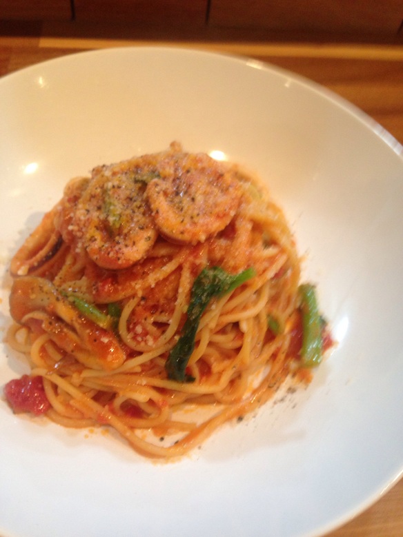 さて、本日のランチパスタは『イカと舞茸のトマトクリームパスタ』¥830です。トマトの旨味と具材とをクリームがしっかりとパスタに絡めてくれてくれて濃厚です。ぜひお試しください。