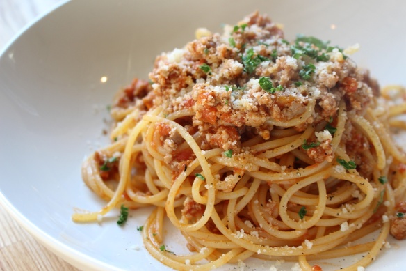ラグーとは煮込みという意味で、粗挽きの挽肉を煮込んだソースのパスタです。ミートソースと言ったほうが馴染み深いと思いますが、、。少しシェフが恰好をつけました。