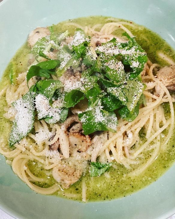 本日、10(火)の日替りランチパスタは、ホタテとルッコラのジェノベーゼパスタです🍝