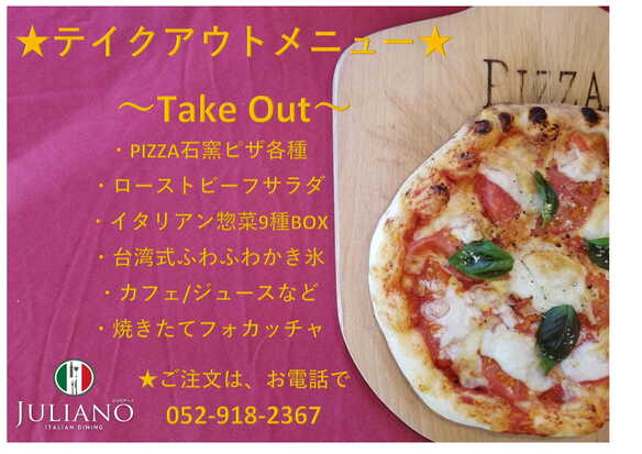 1000円★㉑合鴨スモークと3種のチーズ (パルミジャーノ/モッツァレラ/ゴーダ/合鴨スモーク/パプリカ) チーズとスモークが合う! もっちりした手作りの生地を石窯で一気に焼き上げたもちもちのピザです。 ★テイクアウトご注文方法★ 電話でご注文をお願いします。(受け渡しまでの時間は、通常30分) ・お電話受付時間10:45~14:00/17:00~19:00(木曜日はランチタイムのみ) ・受け取りは店頭にてお渡しします。 ・ランチ・ディナーの込み合うときは、お時間を頂く場合がありますので、ご了承下さい。 TEL 0529182367 イタリアンダイニングジュリアーノ ★「ジュリアーノ・ギフトカード」ちょっとしたお祝いなどに「eギフトチケット」メールで遅れます。 詳しくは↓ http://blancbois.favy.jp/menus/281046