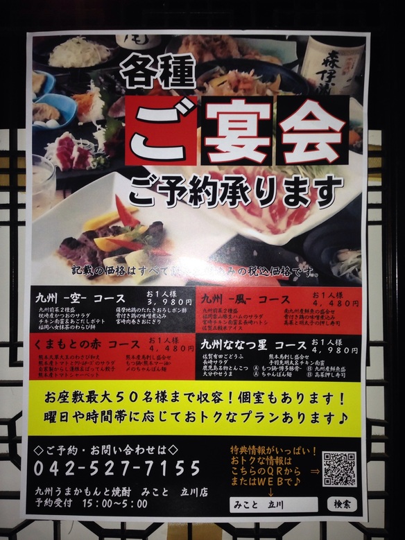 | 店名 | 九州うまかもんと焼酎 みこと 立川店 (キュウシュウウマカモントショウチュウミコトタチカワテン) |