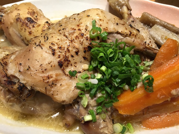 宴会メニューもね。写真は、今回の 空 コース の骨付き鶏と根菜の味噌煮込みです。ワイルドに手で召し上がって下さい!