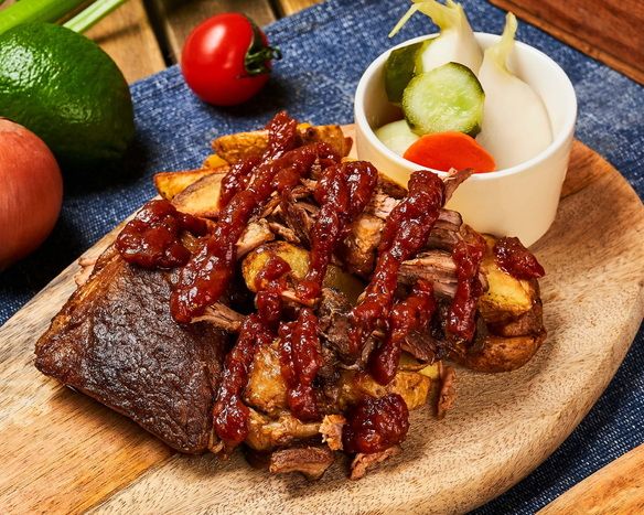 じっくりグリルしてスモークの香りをつけました ローストポテト、オニオン付きです