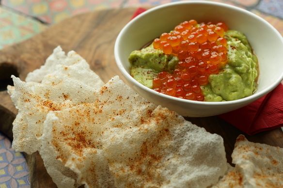 レモンの酸味とライムのフレッシュさが効いた特製の冷たいアボカドソースを熱々に揚げたエビ煎にデップして食べて頂く前菜です。