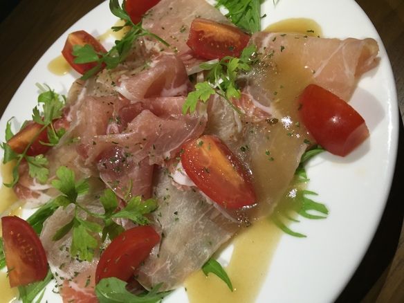生ハムのスライスを野菜とドレッシングでシンプルに仕上げた前菜。