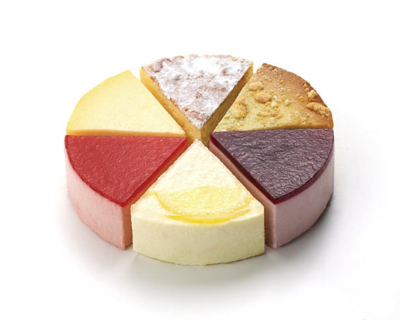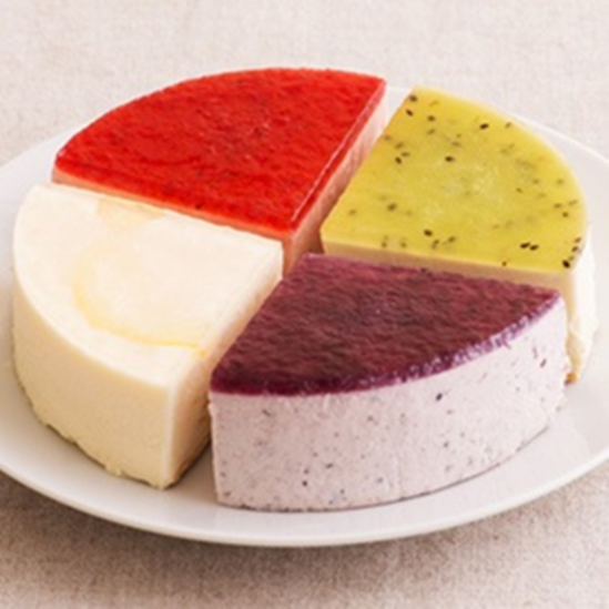 人気のパルメジャーノ、カマンベール,ゴルゴンゾーラのベイクドチーズケーキとレモンとストロベリーにブドウのレアチーズケーキが加わった6種類のチーズが楽しめる贅沢なアソートチーズケーキです。