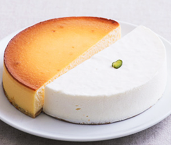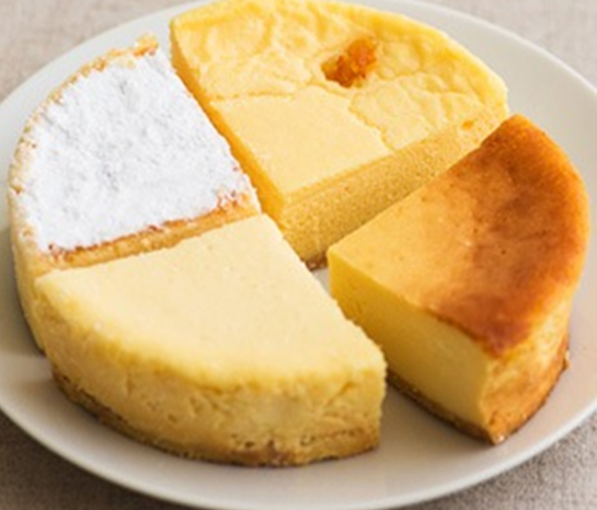 プレーン(パルミジャーノチーズ)・クリームチーズ・マスカルポーネチーズ・濃厚スフレの4種類の味が楽しめます。1つのホールチーズケーキで4つのお味が楽しめ、それぞれのチーズの特長に合わせた製造で少しずつ変わる食感、口の中で広がる香りが食欲をそそります。