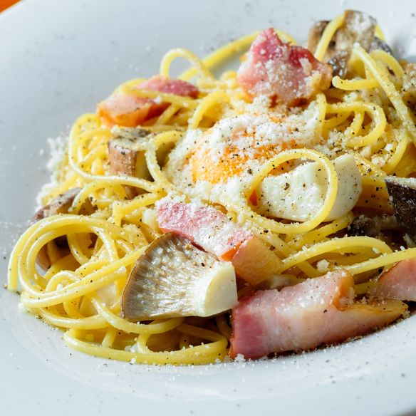 生パスタ(タリアテッレ)使用。クリームがよく絡む平打ち麺のもちもち食感をお楽しみください。