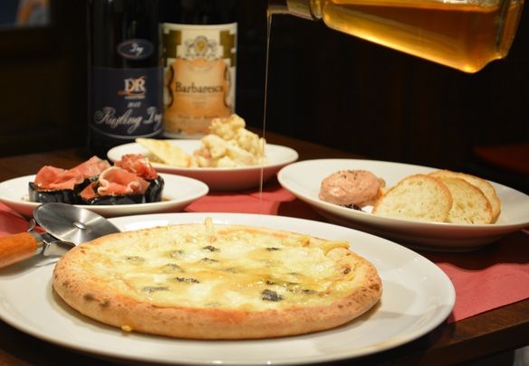 4種チーズ(ゴルゴンゾーラ、パルミジャーノ、モッツァレラ、シュレッド)を使ったピッツァ。蜂蜜を掛けてお召し上がりください。