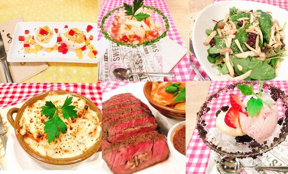 前菜 シーフードサラダ 爽やかなカクテルソースでどうぞ デビルドエッグ スープ オニオングラタンスープ サラダ クランベリーとナッツのほうれん草サラダ (オレンジバルサミコドレッシング) メイン マッシュルーム、エシャロット、 ハーブ、ガーリックを詰めたテンダーロインステーキ サイドディッシュ ホームメイド ラビオリ トマトクリームソース デザートプレート アイスクリーム クラッシュチョコレートクッキー添え ホームスタイルキャロットケーキ・イングリシュクリーム お飲物 コーヒー or 紅茶 1. Appetizers • seafood salad with zesty cocktail sauce • Deviled eggs 2. Soup Onion gratin soup 3. Salad spinach salad with cranberries & pine nuts (our original orange & balsamic base dressing ) 4. Main Beef tenderloin steak (stuffed with mushrooms, shallots, garlic and herbs) side dish tomato cream sauce ravioli 5. Dessert plate Ice cream served with martini glass rimmed crushed chocolate cookies, home style carrot cake with English cream 6. Coffee or Tea