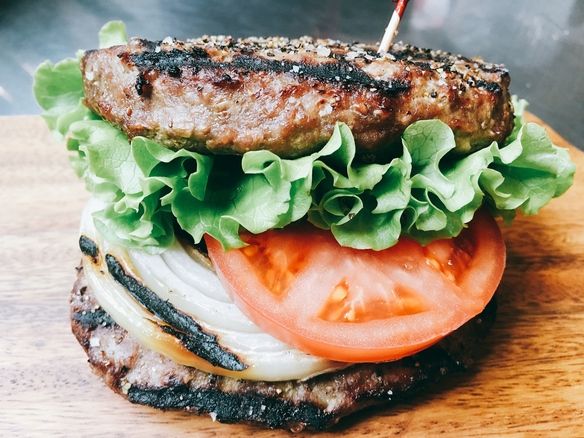 バンズの代わりに、フレッシュトマトと焼きオニオンを熟成プレミアムビーフで挟み込みました。 お肉の重量だけで.圧巻の300グラム‼︎