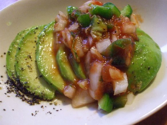 新鮮なアボカドを、オリーブオイル、岩塩、サルサで食べるシンプルイズベストな一品。