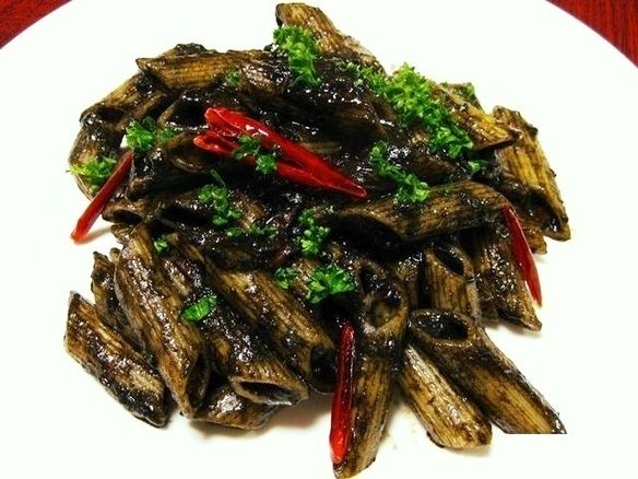 スペイン名物 イカのイカ墨煮をペンネにしました。 お客様からも大好評の一品です。