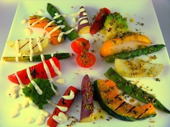 チーズマスタードソースと香草アンチョビパン粉の2つの味を味わえます。 (野菜の内容は変わります。)