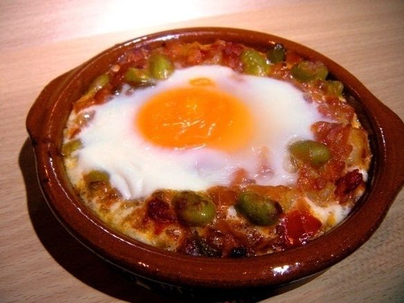 真っ赤なトマト、黄色の卵、グリーンの豆、赤のチョリソと生ハム。 スペイン アンダルシア セビージャの郷土料理