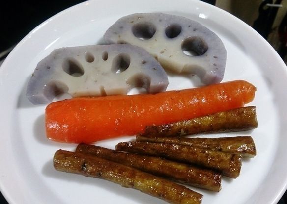 ゴボウ、レンコン、人参の3種類の根菜をコンフィーにしました。 野菜本来の旨味と味を感じて頂ける一品。