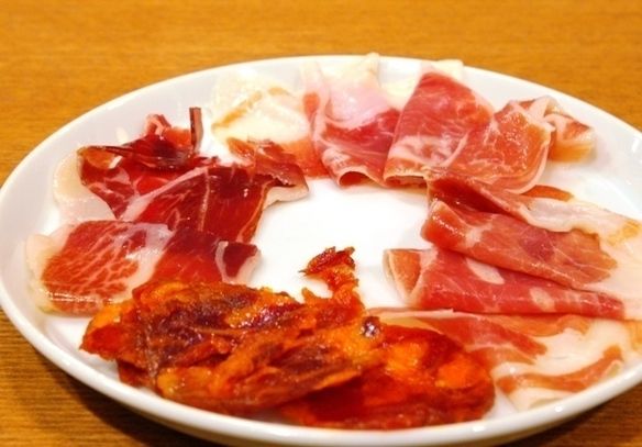 イタリアとスペインの生ハム、イベリコ豚ベジョータのサラミの盛合せ。
