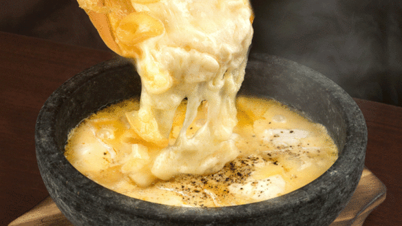 ソースには国産チーズを3種類使用。石焼に入ったグツグツのリゾットをお客様の目の前に運び、最後に国産ラクレットをたっぷりかけて。具材のベーコンは鹿児島の幸福豚を使い、旨味もプラスしています。