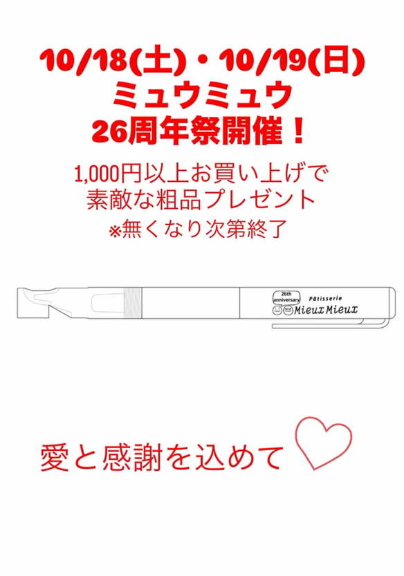 本当は9/8が創業の日ですが、ようやく暑さも落ち着きましたの10/18(土)・10/19(日)の2日間、ミュウミュウ26周年祭として、皆さまを心よりお迎えさせていただきます。