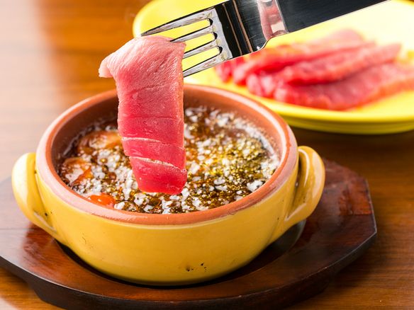 こだわりの本鮪を贅沢に使った【スパイラル】オリジナルメニュー。ニンニク、唐辛子などを入れ、温めたオリーブオイルに、本鮪の中トロをさっとくぐらせて、しゃぶしゃぶのようにしていただきます。