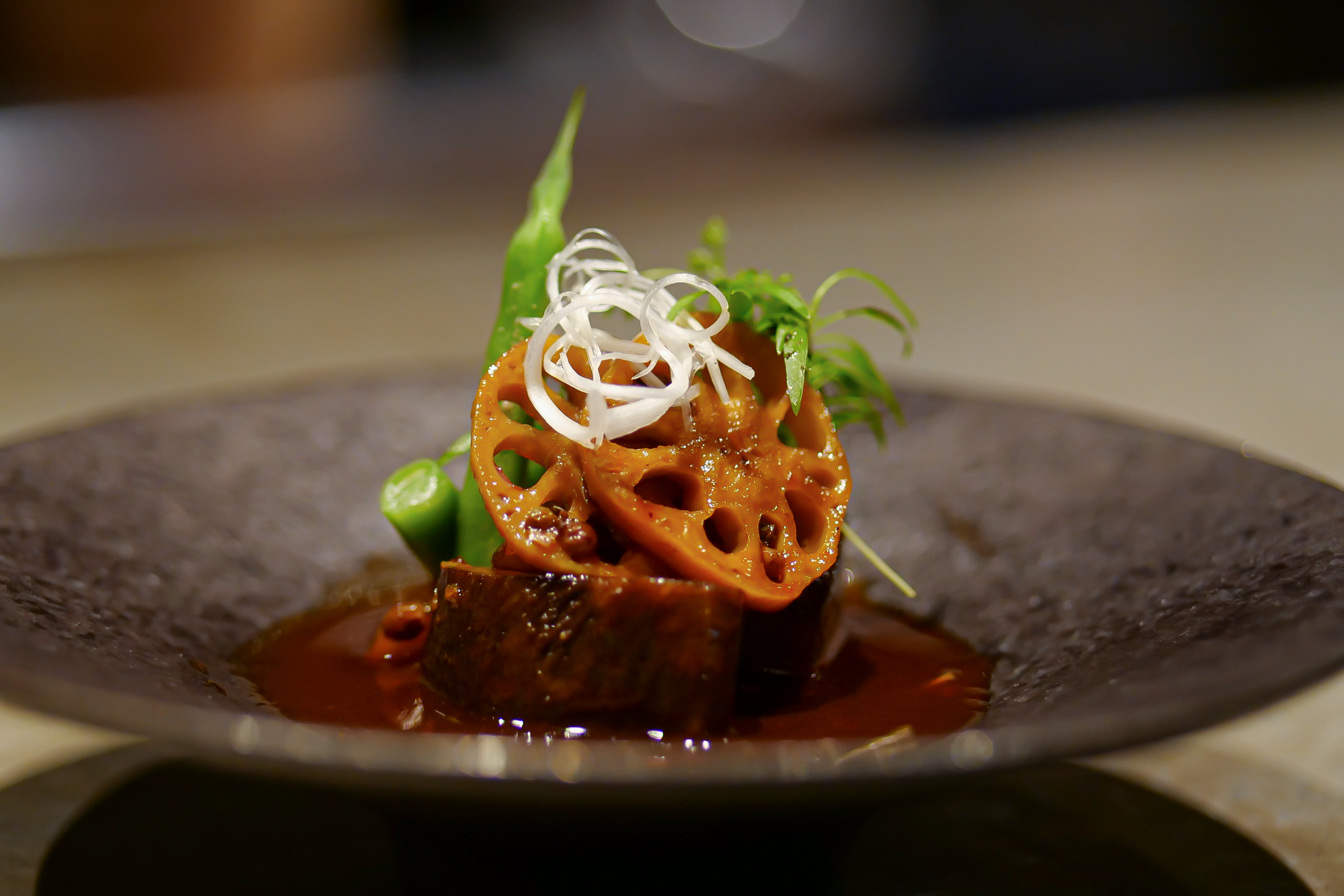 新宿駅より徒歩5分「アドホック新宿ビル」5階のシェア型フードホール『reDine 新宿』内にある完全会員制の焼かない焼肉店『29ON 新宿本店』。季節の食材を低温調理した薄切りサーロインで巻いて...