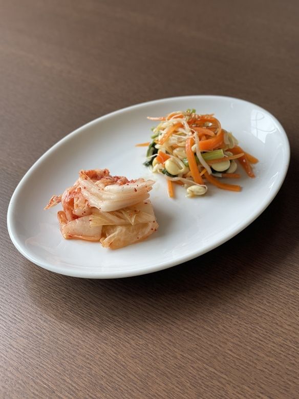 お酒がすすむ!和出汁香るもやしナムルと甘酸のキムチです。