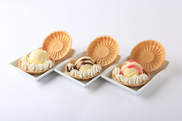 締めに大人気のスイーツです。モナカにしたのは、スプーンを使わず「がブリ!」と豪快に食べてほしいから。アイスクリーム、ホイップクリーム、シロップなどが入っています。