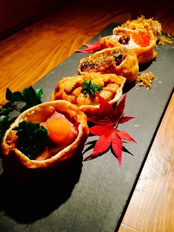 320円※ウニ、いくら、甘エビ、中落ち、芽葱、沢庵 函館、大分、福岡の仲卸さんから直送される旬のネタを、明かすと呼ばれる江戸時代から伝わる伝統製法の酢が効いたシャリと共に握ります。