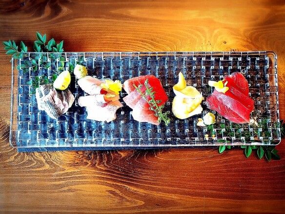 1,800円函館、大分、福岡の仲卸さんから直送される旬のネタを、明かすと呼ばれる江戸時代から伝わる伝統製法の酢が効いたシャリと共に握ります。