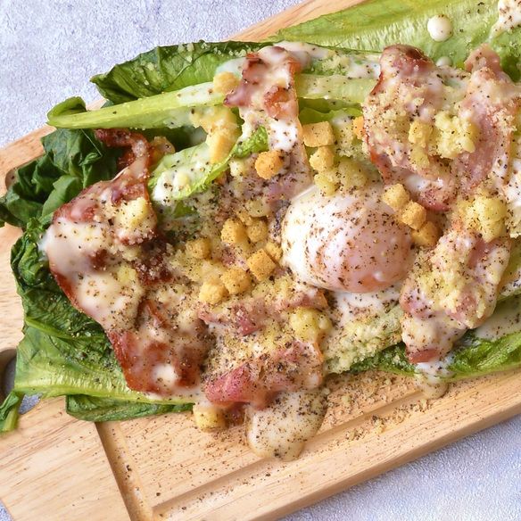 ド迫力!大きくカットしたロメインレタスを大胆にグリルした変わりサラダ。チーズの風味とベーコンの香ばしさが口の中に広がり、焼きロメインの食感と一緒にゴージャスにお楽しみ頂けます。