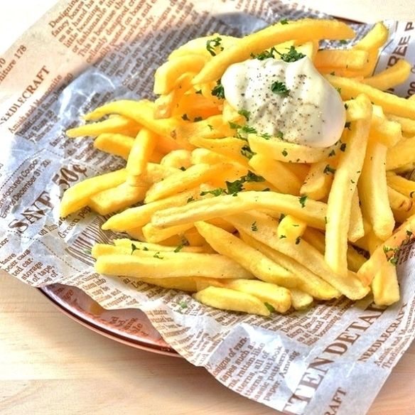 お酒のおつまみに最適な揚げたてのほくほくポテトフライに塩味のきいたアンチョビソースをたっぷりのせてお洒落で美味しいタパスに!ビールにもワインにも合う、お酒が進む人気おつまみです。