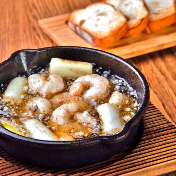 にんにく風味のオイルで炒め煮にする「アヒージョ」は、バルの代表的な小皿メニュー。エビの旨みが溶け出た絶品オイルを香り高いハーブが包み込むような味わいです。アッツアツの鉄板で出されるアヒージョはオリーブオイルの香りと一緒にぷりぷりの海老の食感をお愉しみいただけます。