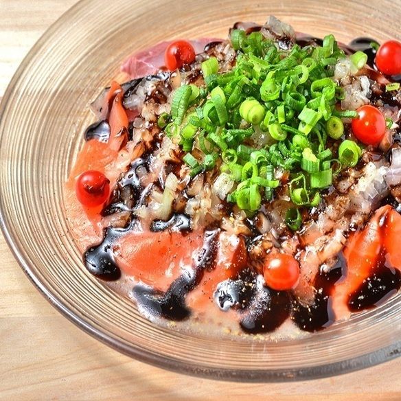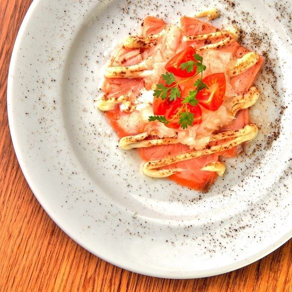 サッと炙ったとろけるサーモンを旬の野菜と一緒に彩り鮮やかに盛り付けた逸品♪サーモンに含まれるEPAや玉ねぎに含まれる硫化アリルが血液をサラサラにし、トマトに含まれるリコピンやビタミン、ミネラルがお肌を丈夫にすると言われています。身体の中から美しくなれるお洒落な一品です。