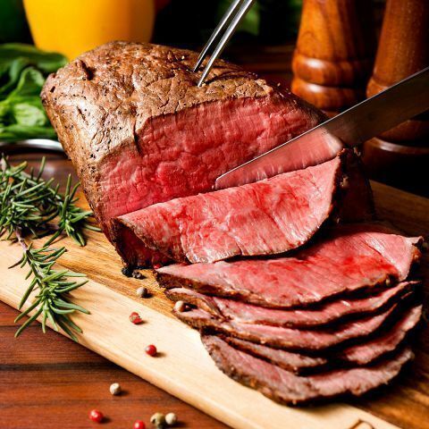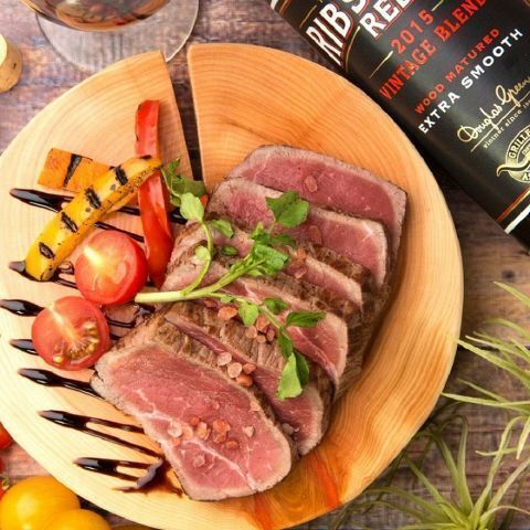 大迫力の塊肉を低温でじっくり火を通してから提供する当店自慢のローストビーフはしっとり柔らかな食感♪口に入れると赤身の旨味や脂身の甘みが口いっぱいに広がります!