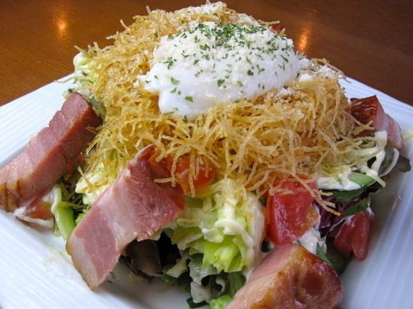 ベーコンとカリカリジャガイモを温泉卵で混ぜて。 一家一番人気の不動の四番バッターです。