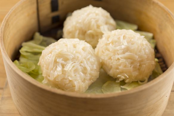 「梅の花」の豆腐焼売を蒸籠で蒸し上げました。 千葉県野田市の梅醤油でどうぞ。