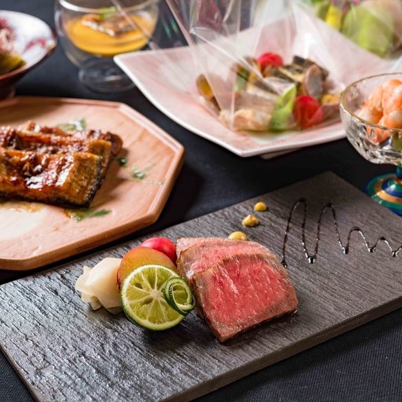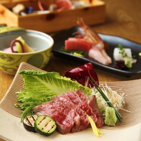 月替わりのプリフィクスコースの主菜に山形牛サーロイン炙り焼きなどワンランク上の主菜をご用意したプリフィクスコースです。 コース内容(全8品) 〔先 附〕 松茸と古白鶏の摘入れ 〔前 菜〕 旬の前菜 五種盛り 〔煮物椀〕 松茸と古白鶏の摘入れ ※どちらかお選び頂けます。 〔向 附〕A:本マグロと日替わり日本海直送鮮魚 〔サラダ〕B:蕪と炙り笹身の胡麻サラダ 〔 鍋 〕 真鯛のしゃぶしゃぶ仕立て 〔主 菜〕※いずれかお選び頂けます。 A:低温調理 山形牛サーロイン炙り焼き B:秋鯖の麹焼き C:豚ヒレ真空ロースト 〔食 事〕※どちらかお選び頂けます。 A:土鍋で炊いた銀シャリ 特製のお供 B:京揚げ きつね蕎麦 〔甘 味〕 和のスイーツ三種盛り 珈琲 又は 焙じ茶付き