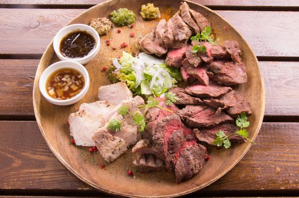 がぶ一番の人気メニュー!! 特選黒毛和牛ステーキ、雪室熟成豚バラ、イベリコ豚生ソーセージの3種類。