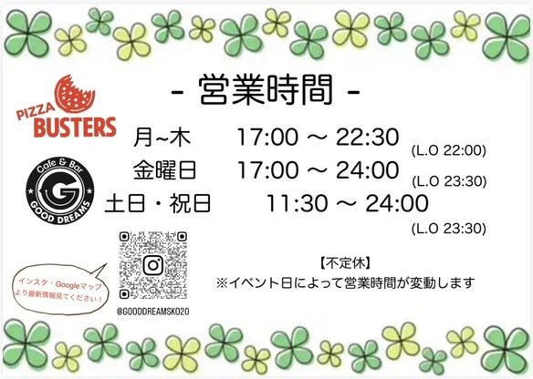 イベントによって、時間が変わります。SNS、Googleマップにてご確認をお願い致します。