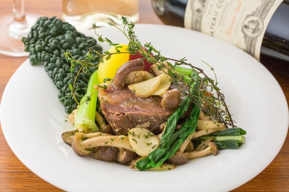 柔らかく煮込んだほほ肉たっぷりキノコのブルゴーニュバターソースで!