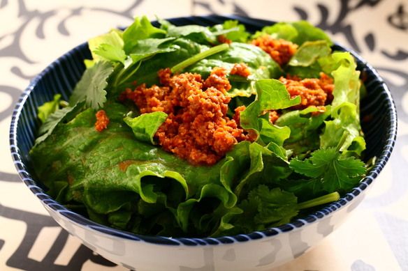 インパクト絶大、たっぷりパクチーと羊肉味噌のサラダ。