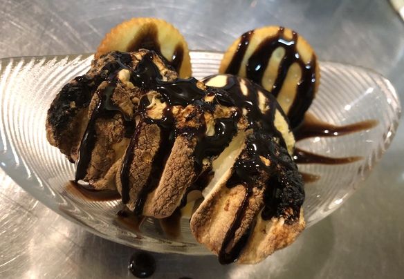 蒸し焼きしたバナナ ➕ アイス ➕ ビスケット ➕ チョコソース ➕ シナモンパウダー