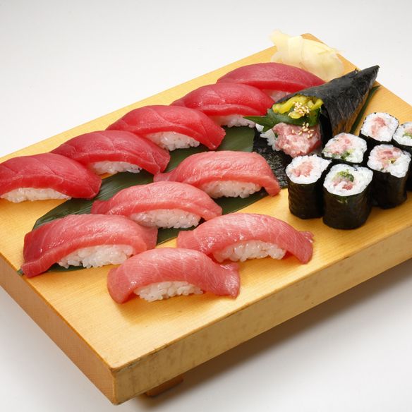 Fatty tuna (2 pieces), Tuna (3 pieces), Negitoro gunkan (minced tuna with green onion /1 piece), Torotaku gunkan (minced tuna with pickled radish /1 piece), Negitoro roll (small / 1 roll).This popular sushi combo is served in a half serving. Salad and miso soup included.