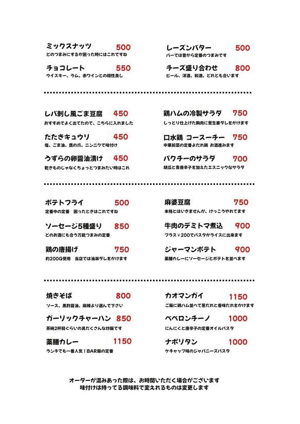 18:00〜00:00 不定休 お休みはNEWSでチェック願います。 |