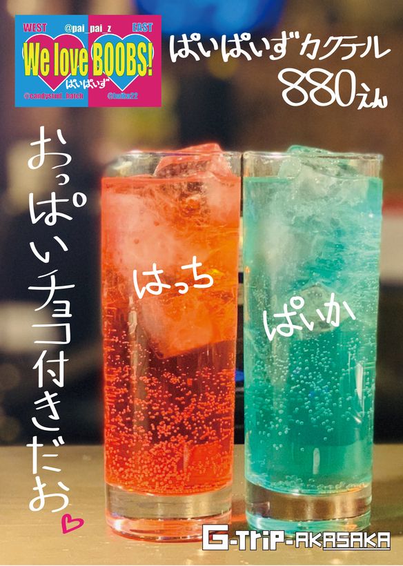 DJユニットぱいぱいずと、エナジードリンクHEKATEとのコラボカクテル! ストロベリー味のはっち。 スッキリミントのぱいか。 あなたは、どっちとぱいぱいする⁉️ しかも、おっぱいチョコ付き^_^