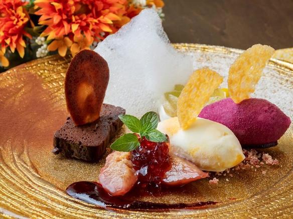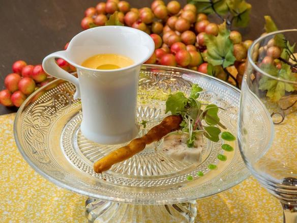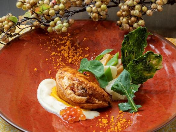 ショーソンとは小さい円形のパイ生地の中にいろいろなものを詰めて半分にたたんで焼き上げた半円形のパイ料理の事です。今回は鮑、秋鮭ムースなどを敷き詰めました。ジャガイモのペースト、ブールブランソース、自家製のイクラと一緒にお召し上がりください。