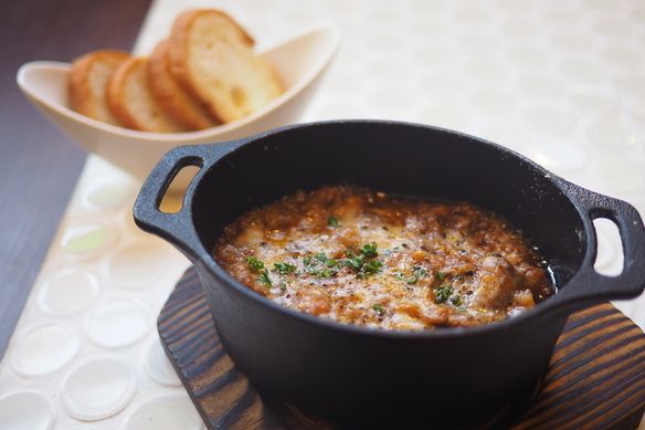 和牛すじをトマトソースで柔らかく煮込みました。チーズをかけてオーブンで焼き上げます。