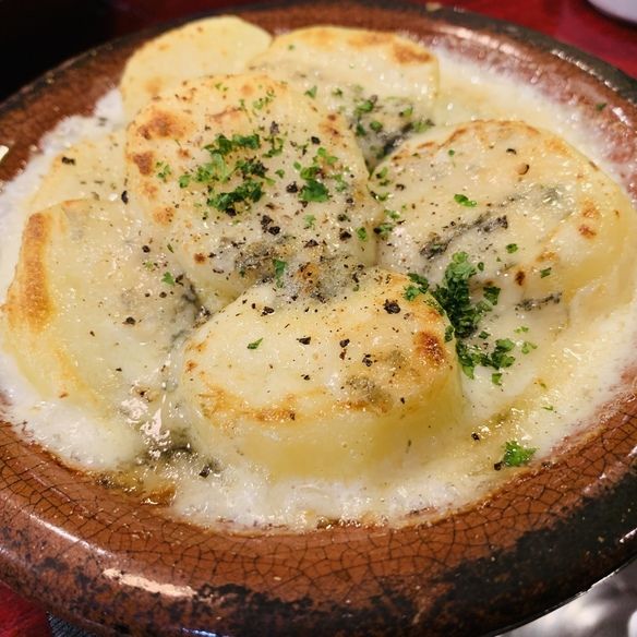じゃがいもをクリームで柔らかく煮込み、ゴルゴンゾーラチーズをのせて香ばしく焼き上げます。