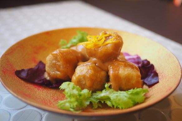 外はカリッと中はほくほくの里芋を味噌ソースで。マスカルポーネを入れてワインに合うおつまみに♪